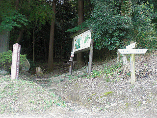 | 登山口から4分で森に入ります。 | 森に入って5分で分岐点。説明板があります。 |