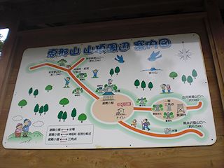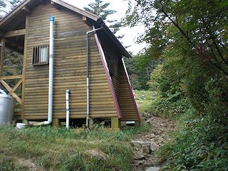 | トイレには山頂周辺案内図があります。奥には山頂小屋があり、その裏の岩場に上がると展望が広がります。 | |