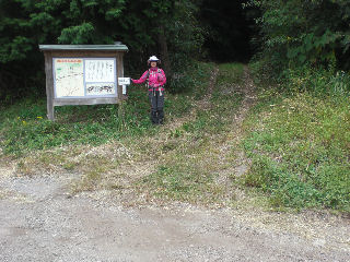 | 分岐に戻り殿様道を進むと、3つの看板のあるT字に当る。右の東の峠へ進むが、左の牧場跡でお昼をいただく。 | |