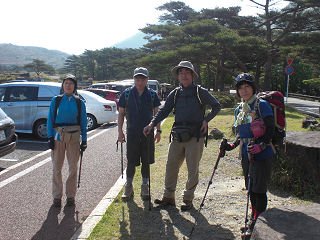 | えびのエコミュージアムセンターに駐車し支度をして出発。 | 車道を横切ると韓国岳登山口の標柱があります。 |
