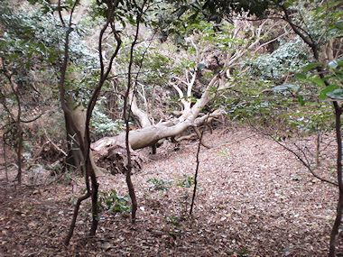 | 215mピークを目指し、照葉樹の尾根道を進みます。 | ピークのすぐ先のテープから右へと下ります。 |