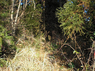 | 峠から13分の植林帯で、左上方へと進みます。 | 急傾斜をあえぎながら登ります(写真は下山時) |