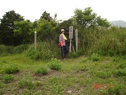 | ひたすら登ってようやく山頂に到着。猟師さん に近くの山の道を教えていただきました。後方 の樹林帯を進むと「へびん湯」に下りつきます。 |