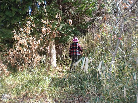 | 笹竹を刈ってクヌギ林の手入れをしていた元気なwさん。前掛姿がかっこいい! |
