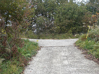 | 広場から1分で山頂台地。奥の方に看板が一つあります。 | 台地の東端から南に下る堀切のような道を進みます。 |