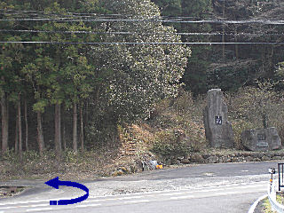 下山してお店に寄り、東の台地への道をききます。 お店のすぐ先(国道210号を湯布院方面へ100m位)に 石碑があり、鋭角に左へ曲がります。 |