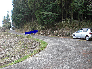| 石碑から0.3キロの左カーブの(広くなった)路肩に駐車。 ここが登山口。山への取り付きを進みます。 |