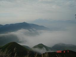 | 合野越を過ぎ樹林帯を抜けた所で振り返ると 湯布院盆地は底霧に包まれていました。遠く にはくじゅう連山と硫黄山の白い噴煙が・・・ |