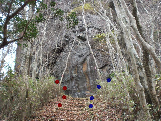 | 高森分岐を過ぎ、山頂の大岩を時計回りします。下りは青。 | 山頂広場の直前の右側に祠があります。 |